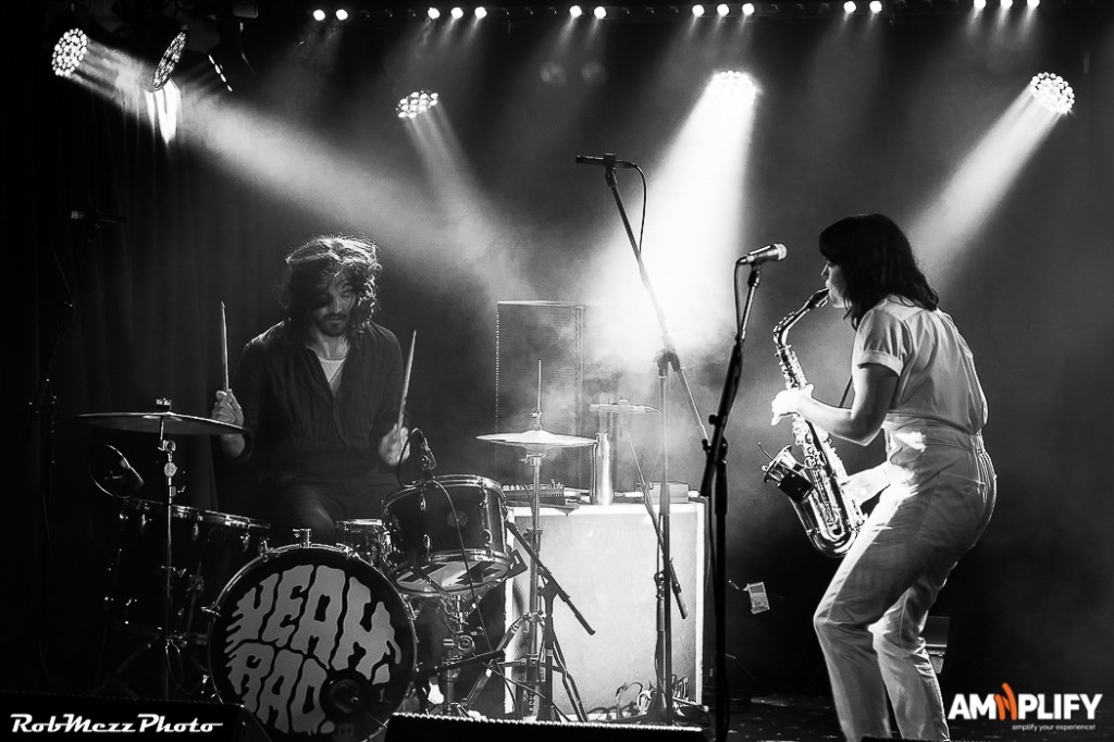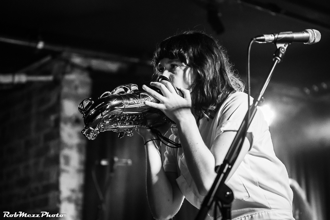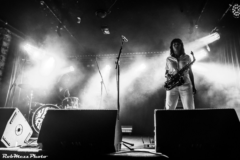 One song blended into another, in what seems like a chaotic improvised jam session, intense and deliberate. Behind the drums, there is wild thrashing of arms, beating them into rhythmic submission, while across the stage, Kirsty prowls and stomps with her sax, blowing the bejesus into one end and screaming intense vocals into the other end.